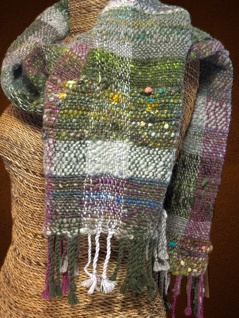 A soft and earthy handwoven scarf in shades of moss green, heather purple, and stone grey. Hand spun and woven in Northumberland, this one-of-a-kind piece of wearable fibre art captures the calm beauty of a forest path.