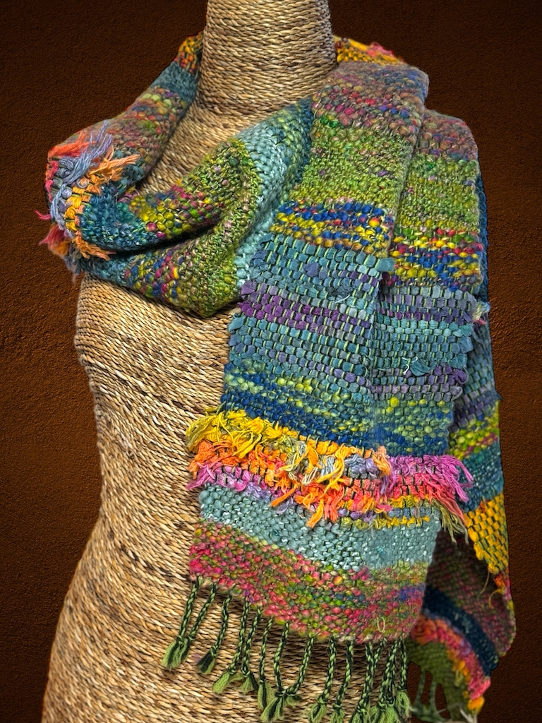 A vibrant handwoven scarf alive with the colours of spring meadows — greens, blues, and soft bursts of pink, yellow, and orange. Hand spun and woven in Northumberland, this joyful piece of wearable fibre art captures the beauty of nature in every thread.