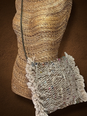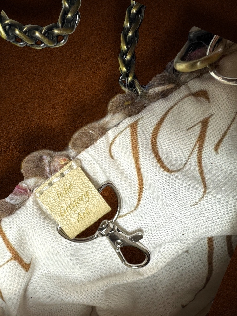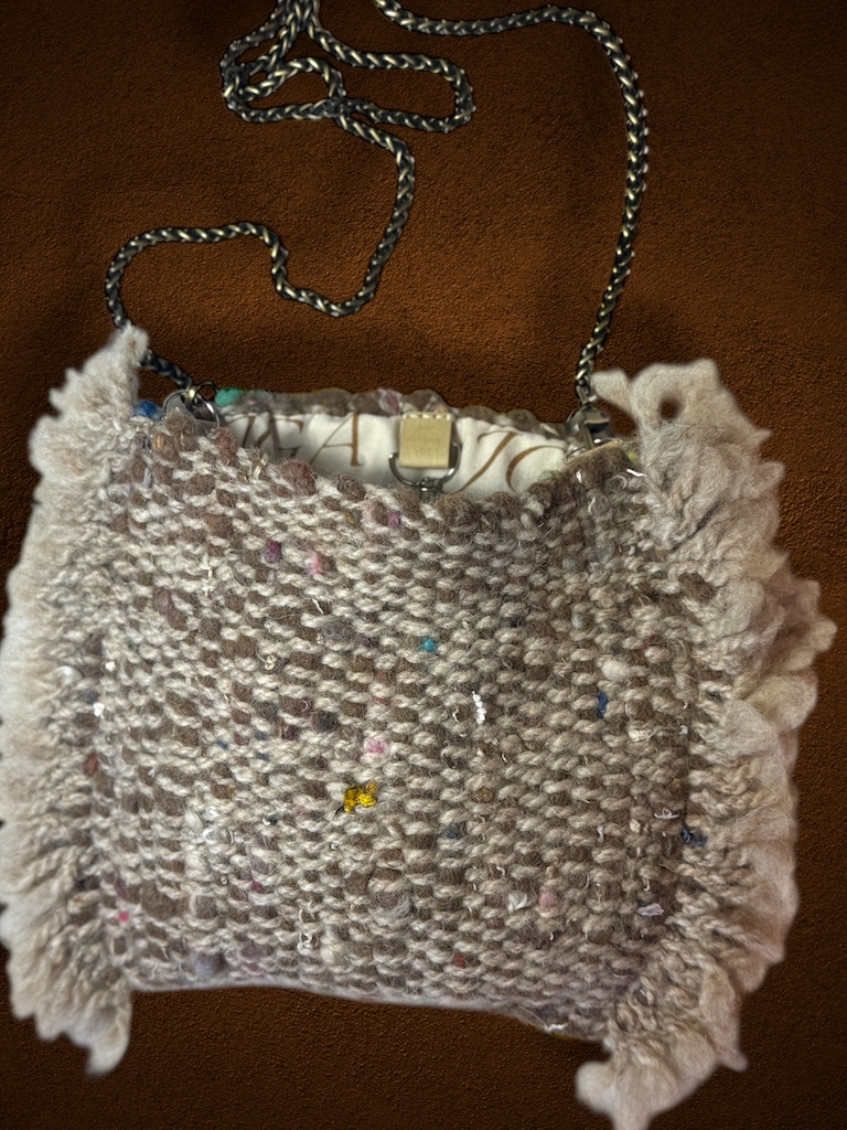 This one-of-a-kind handwoven wool shoulder bag combines rustic texture with a touch of modern detail. Crafted from natural, soft wool in warm neutral tones, the bag features subtle flecks of colour throughout, giving it a lively, tactile character. Each edge is finished with a gentle fringe of unspun fleece, adding softness and individuality to the design. The bag is lined with printed cotton fabric and finished with a secure metal clasp and chain strap in antique brass. Inside, a small leather tag embossed with Julie Gregory Art and a handy key clip add a refined finishing touch. Perfect for carrying essentials, this piece blends art and craft — a statement accessory that celebrates natural fibres, texture, and handmade artistry. All photographs are as true to the original colour as possible, but variations may occur between screens and monitors.