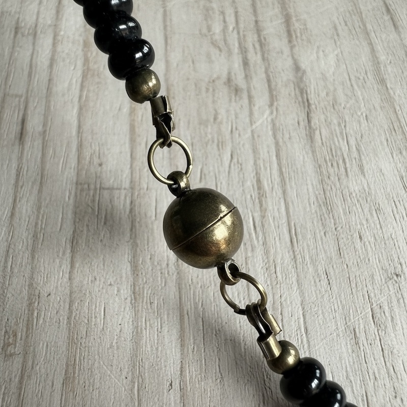 This necklace is made up of brass spacer beads, a stunning brass fish, glass rondelles, small round very dark purple amethyst quarts and repurposed acrylic beads. It measures 20" and has a brass magnetic fastener Free delivery to UK only