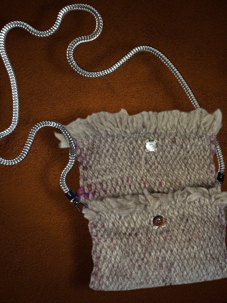 This small handwoven wool shoulder bag combines soft texture with simple elegance. Crafted from natural wool in gentle cream and blush tones, it features a fold-over flap edged with a fringe of unspun fleece — a playful, tactile detail that adds charm and individuality. The compact size makes it ideal for carrying just the essentials, while the silver chain strap offers a contemporary contrast to the natural fibres. Fully lined and finished with a secure magnetic clasp, this piece blends traditional handcraft with modern design. A one-of-a-kind accessory celebrating texture, warmth, and the beauty of handmade work. All photographs are as true to the original colour as possible, but variations may occur between screens and monitors.