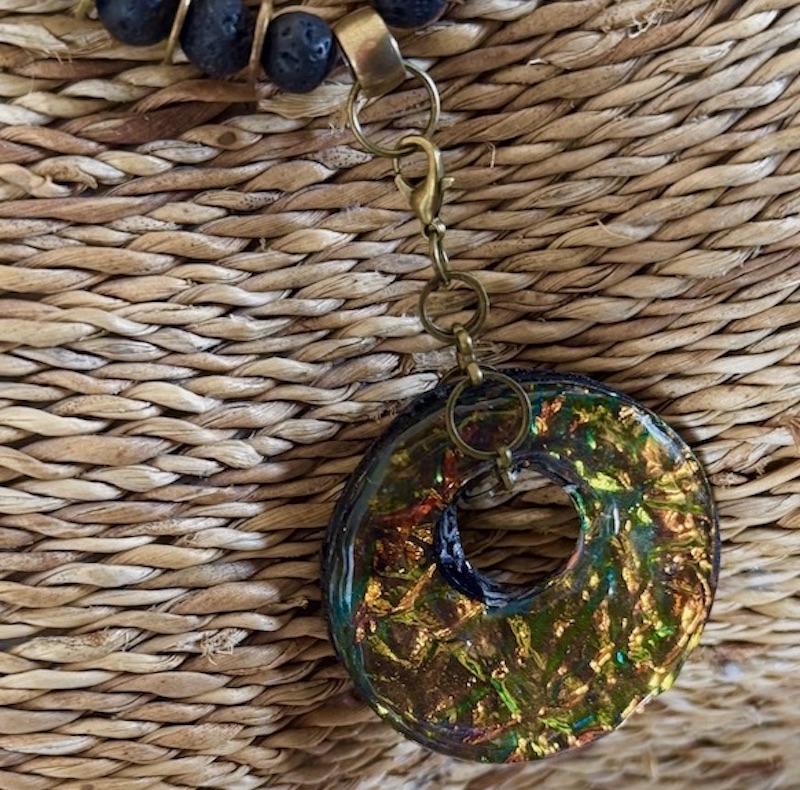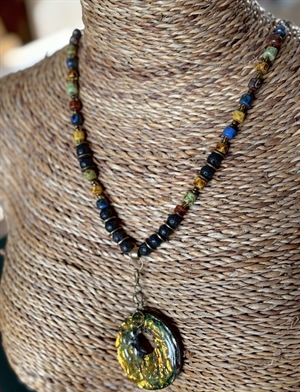 Multi coloured beaded necklace made up of a Hand made resined pendent attached to a strand of Amber,Basalt, Green Chalcedony and Serpentine hung on a bronze coloured metal chain. The spacers are glass and metal. It measures 28" but can be shortened Free delivery UK only