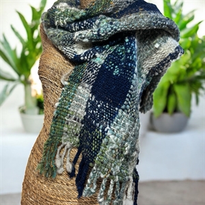 Inspired by the shifting colours of sea and shore, this handwoven scarf blends deep ocean blues, soft greens, and natural stone tones in a richly textured pattern. It captures the calm rhythm of water and the quiet beauty of nature’s palette.